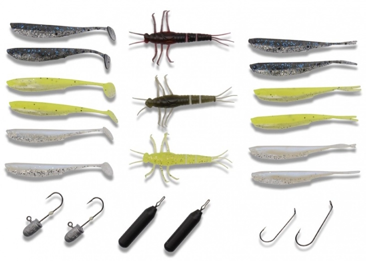 &tyr; 3 x 3D PVC Mayfly (5 cm)• 6 x 3D Fry Paddle hale (5 cm)• 6 x 3D Fry V-hale (5 cm)• 2 x SG Micro Dart Jighead (#8 – 2g)• 2 x Dropshot krog standard S (#8)• 2 x Drop Shot Weight Cylinder S (5g)